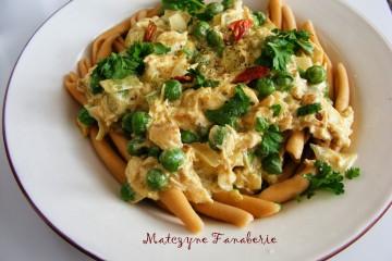 Ugotuj makaron – każdy makaron będzie dobry, u mnie pojawił się makaron z włoskich podróży z odrobina ostrości. Nie piekłam specjalnie łososia, wykorzystałam pieczonego w folii z wczorajszego obiadu. Można oczywiście upiec specjalnie rybę z dodatkiem soli i pieprzu i odrobiną ziół. Cebulę pokrój w piórka i podsmaż na odrobinie oleju. Dodaj drobno pokrojony czosnek. Gdy cebula się zarumieni dodaj mrożony groszek, sos sojowy i pastę curry i przykryj wooka lub patelnie. Jeśli będziesz sos podawać ze zwykłym makaronem dodaj szczyptę chili, aby potrawa nabrała wyraźnego smaku i odrobinę ostrości. Dopraw pieprzem i dodaj śmietanę aby uzyskać delikatny sos. Zagotuj i wykładaj na talerze. Posyp natką i smacznego 🙂