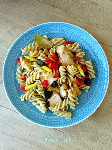 4. Wyłóż na talerz makaron, dodaj pokrojonego kurczaka wraz z cebulką i papryką oraz cukinią. Dodaj pokrojoną suszoną śliwkę. Skrop sosem z oliwy i cytryny.